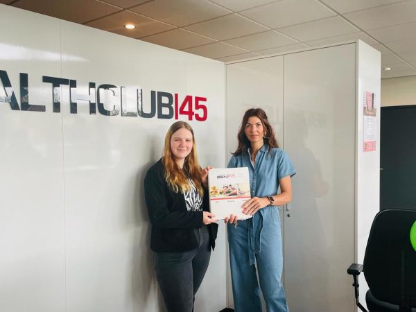 Zwei Frauen präsentieren ein Magazin von "HEALTHCLUB145", einer Ernährungsfirma.
